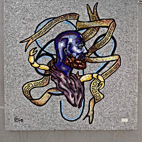This mosaic is located at a private urologist clinic in Heidelberg. The artwork incorporates symbolism, which has personal significance to the client. This symbolism includes: