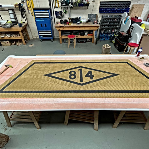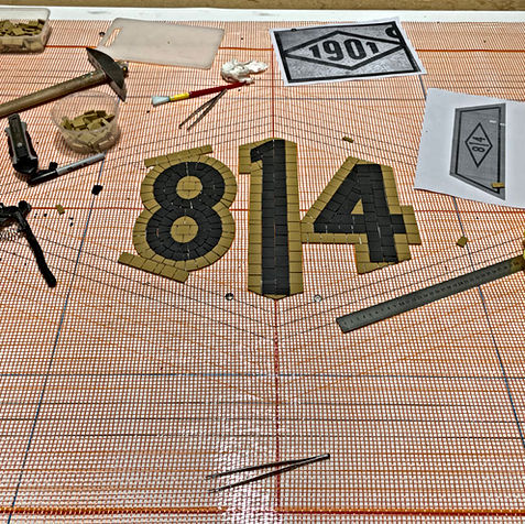 A eye catching mosaic made for the entry threshold at Mecca Mossman NSW. The materials utilised are Winckelmans 2x2cm tiles in yellow with the street number the focus in black.