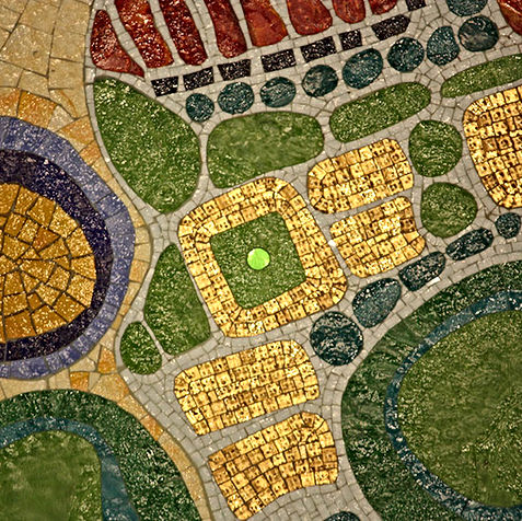 In collaboration with Deboer Design, the mosaic references the scientific fields of microbiology, biology and topography. It abstractly references Scotch College's grounds and buildings, as well as Gardiner's Creek and surrounds. It also references a petri dish with microbiological cell structures. The resin grout also glows in the dark.